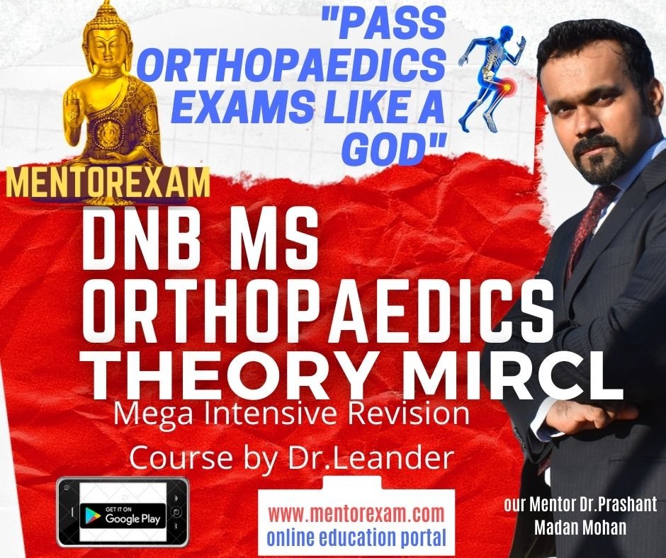 Disclaimer – Wherever possible recall questions and new questions have been solved. All question papers of all years and all questions from each paper are not available, hence can only be updated in future if learners send their recalls to mentorexam.com@gmail.com. This is an initiative to improve the pass percentage of DNB orthopaedics exams by Mentorexam.Mentorexam is not affiliated to DNB or NBE or NMC.Questions have been solved which were sent by recall of exam goers and learners.These questions are representative of real exam and are not claimed to be from the real exam, any resemblance is coincidental and Mentorexam does not take any responsibility for any harm or loss.This is purely for educational purpose.